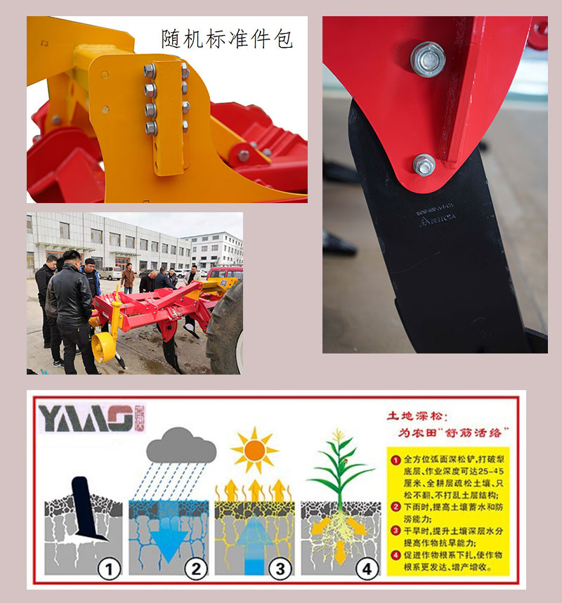 4、使用效益高; 采用原裝進口硼鋼深松鏟,具有高強度和超耐磨性,比傳統(tǒng)部件使用壽命提高3-4倍,并利用保險螺栓進行過載保護。使用壽命長