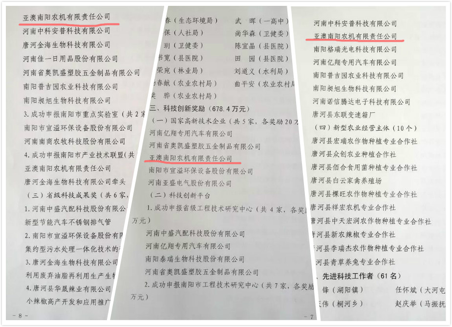 亞澳農(nóng)機(jī)共獲得政府獎(jiǎng)勵(lì)35萬(wàn)元。包括成功申報(bào)國(guó)家高新技術(shù)企業(yè)20萬(wàn)元獎(jiǎng)勵(lì)、市級(jí)工程技術(shù)研究中心5萬(wàn)元獎(jiǎng)勵(lì)、南陽(yáng)市產(chǎn)業(yè)技術(shù)聯(lián)盟10萬(wàn)元獎(jiǎng)勵(lì)10萬(wàn)元。
