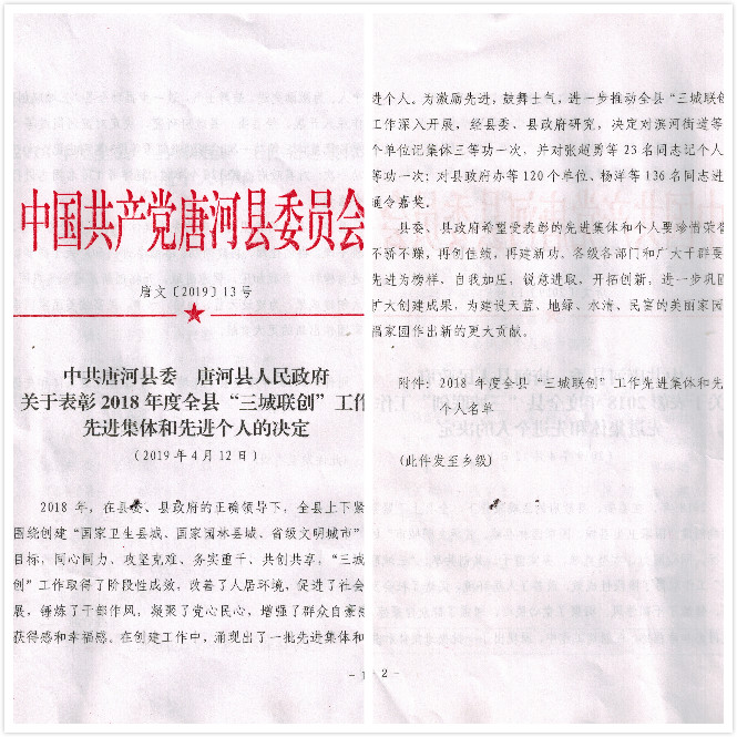 2018年,我公司緊緊圍繞創(chuàng)建“國(guó)家衛(wèi)生縣城、國(guó)家園林縣城、省級(jí)文明城市”的目標(biāo),上下一心,做好廠區(qū)環(huán)境整頓及綠化建設(shè)。獲得此項(xiàng)榮譽(yù)是縣委縣政府對(duì)我們工作的肯定。