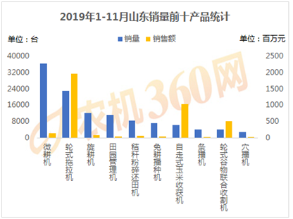 2019年1-11月,上榜山東用戶購機(jī)量前十的農(nóng)機(jī)產(chǎn)品如下圖所示,微耕機(jī)、輪式拖拉機(jī)、旋耕機(jī)等10種農(nóng)機(jī)合計購買力11.5萬多臺,是山東農(nóng)機(jī)總銷量的86.54%,對這10類農(nóng)機(jī)的購機(jī)支出達(dá)38.55億元。