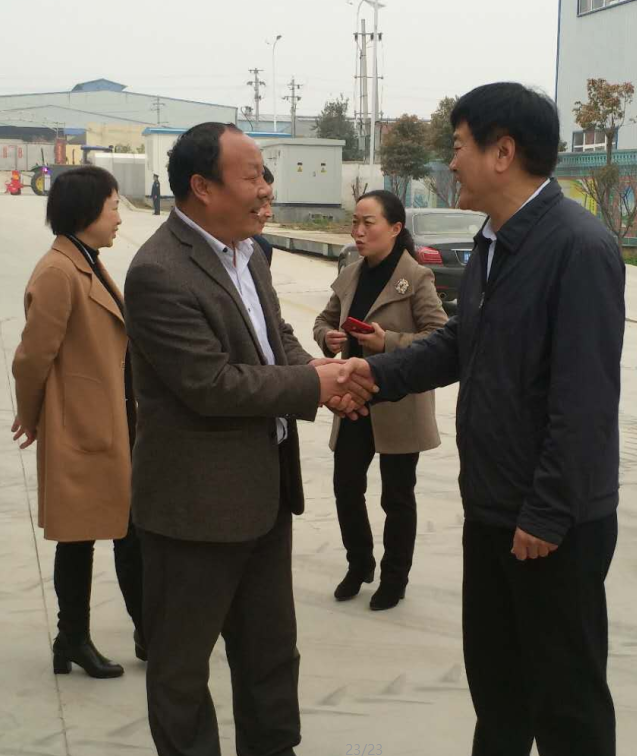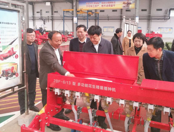 參觀過程中,劉樹華部長親切的向郭總咨詢公司的產(chǎn)品,郭總向劉樹華部長簡述了2BF-6/13 多功能花生精量播種機的功能構(gòu)造,在得知該款機型當年投產(chǎn)當年熱銷后,劉部長十分高興的對郭總說:“亞澳要進一步開展科技研發(fā)工作,多培養(yǎng)、招聘科研人員,增強自身科研力量,成為農(nóng)機具行業(yè)的標桿”,周天龍縣長對劉樹華部長說:“縣政府已批給亞澳30多畝土地,作為亞澳的科技研發(fā)中心”。